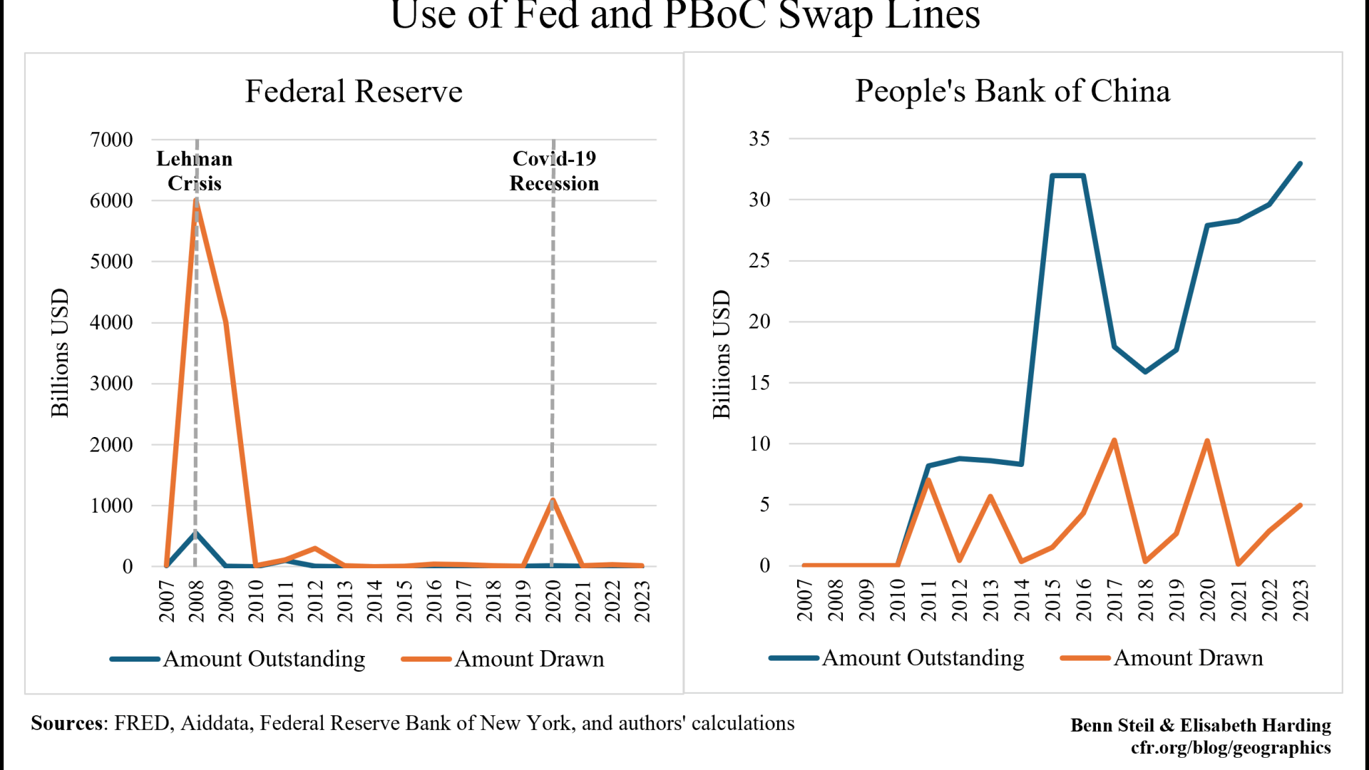 Though PBoC swap lines are marketed as a means to facilitate trade settlement in RMB, more than three-quarters of its partners have drawn on them to address individual solvency problems—those related to balance of payments and sovereign debt. Permanent Fed swap lines, in contrast, have been issued to only a handful of the world’s richest countries in order to meet short-term liquidity needs during times of global financial stress—such as during the 2007-2008 financial crisis and 2022 Covid-19 pandemic.